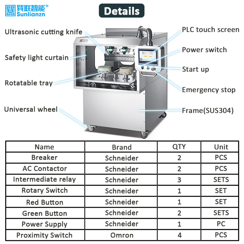 تحتوي آلة القطع بالموجات فوق الصوتية XL-1000a على ثلاث سكاكين قطع مصنوعة من سبائك التيتانيوم، والتي يمكنها قطع الكعك المجمد عند درجة حرارة -15 درجة مئوية.